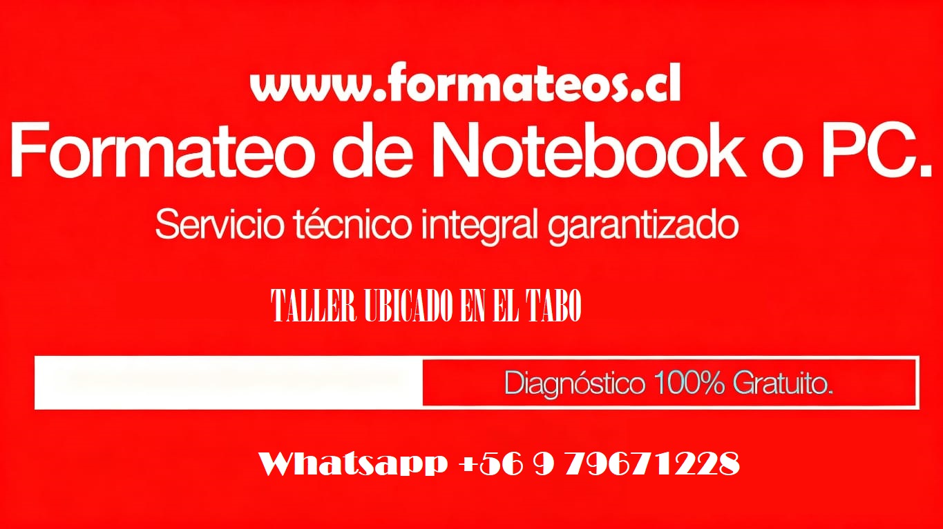 Formateo de PC | Notebook / Laptops TALLER UBICADO EN EL TABO Deja tu equipo en manos de expertos Formateos CompuXtreem te ofrece un servicio totalmente completo de formateo de pc y notebook, Laptop con instalación de sistema operativo y programas Útiles. Todos los programas con activación permanente y 90 días de garantía técnica . Valor promocional $12.000 El servicio se realiza en mi taller ubicado en el Tabo sector el Pinar